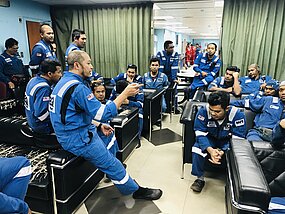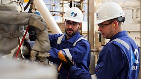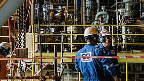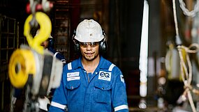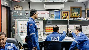 Mid shot EQ workers on production deck | Malaysia | Seligi